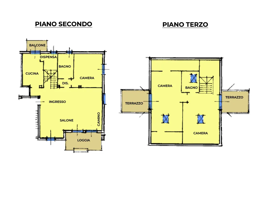 Così disposto: salone con camino, cucina con dispensa, camera matrimoniale, bagno e ripostiglio al piano secondo mentre al piano mansarda troviamo le due camere, altro servizio e due ampi terrazzi.