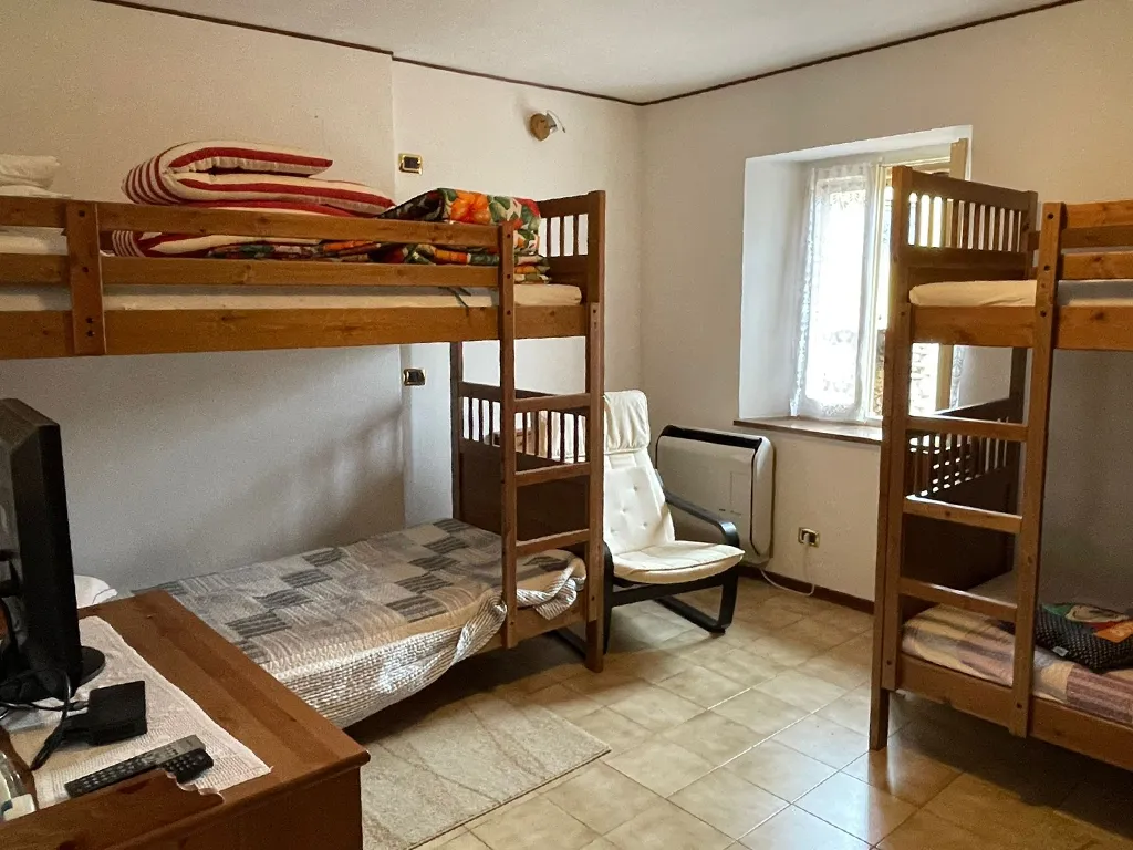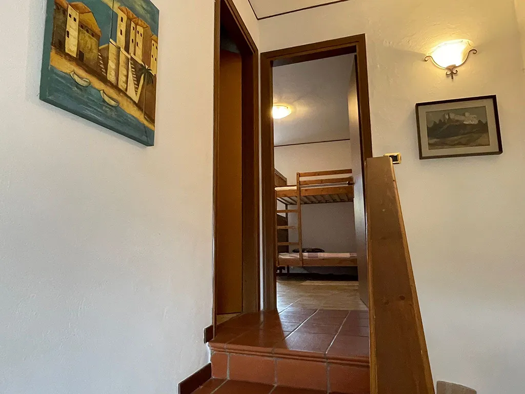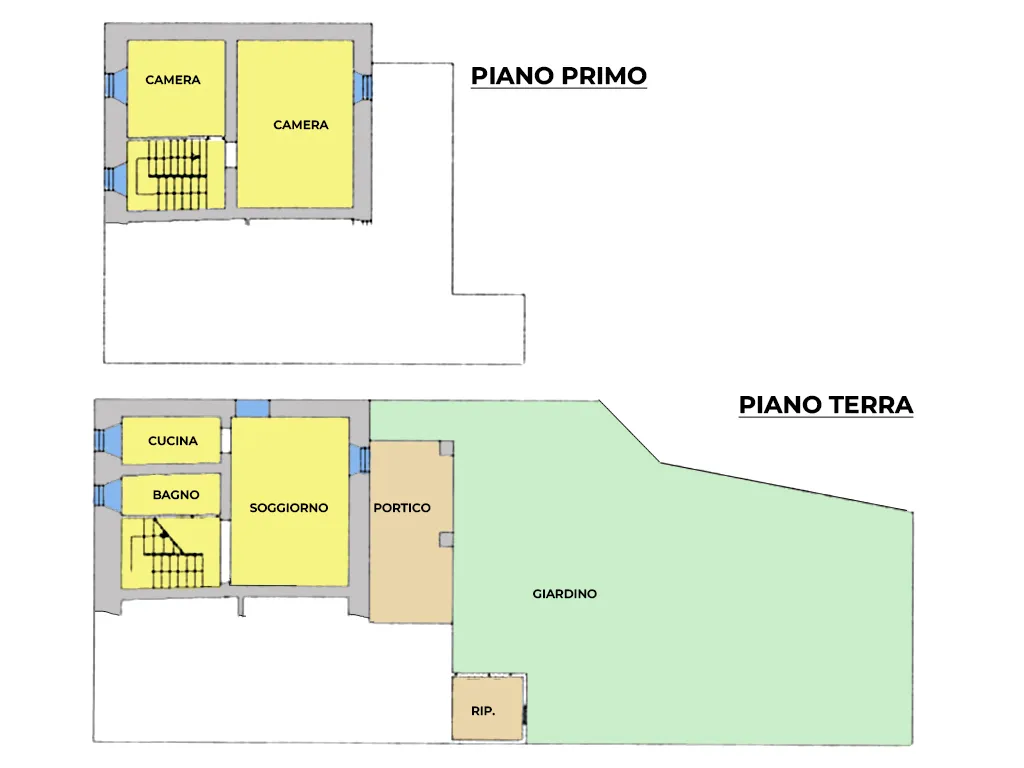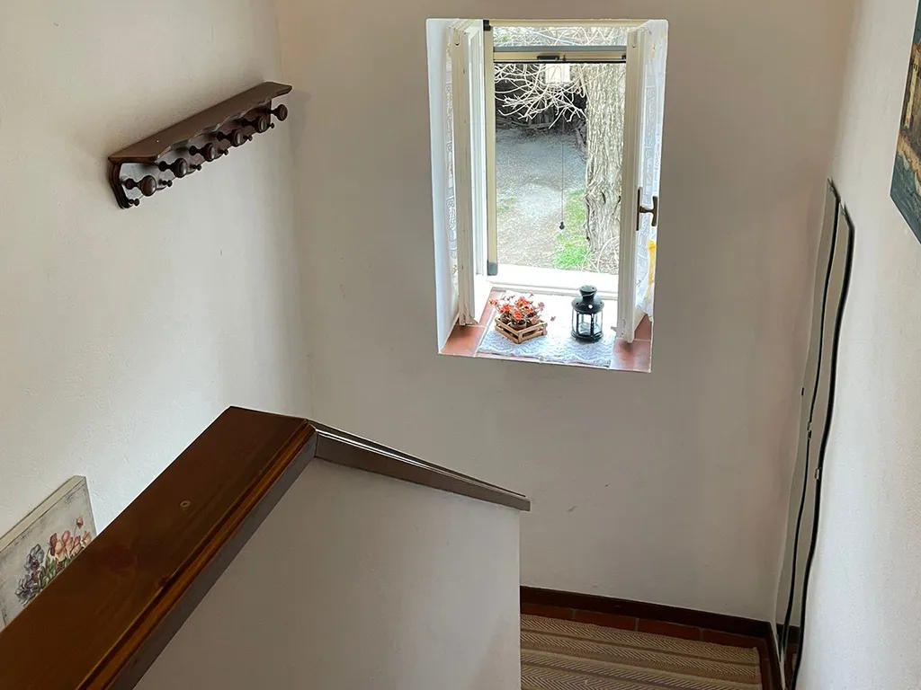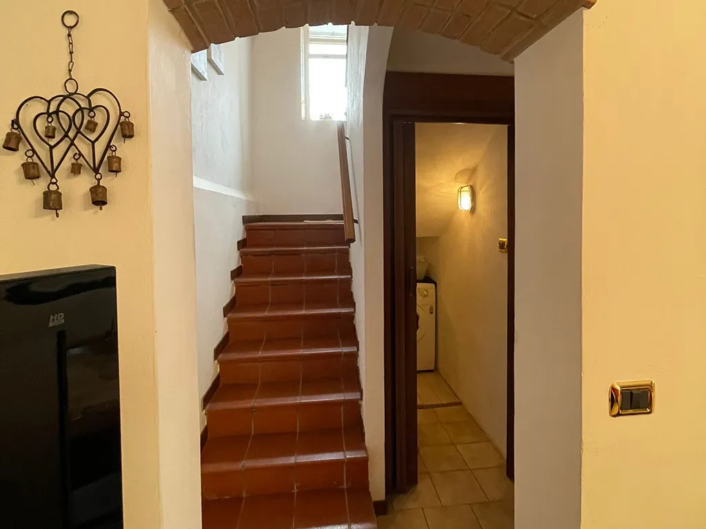L'abitazione è disposta su due livelli, al piano terra troviamo ampio portico, ingresso, soggiorno con camino, cucinotto, bagno, lavanderia e legnania, al piano primo disimpegno e due camere.