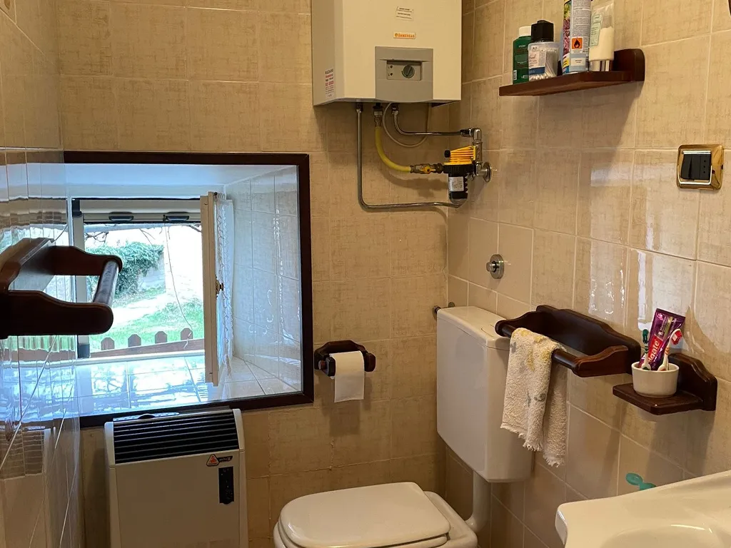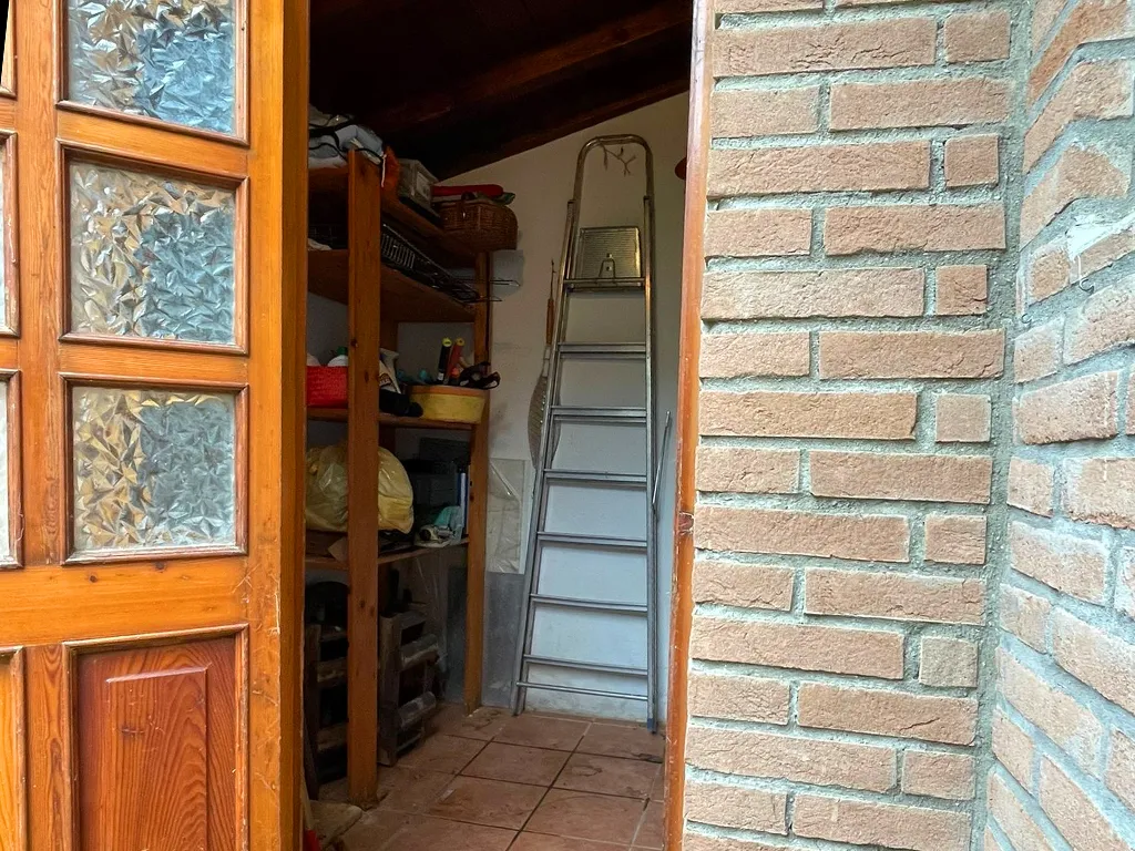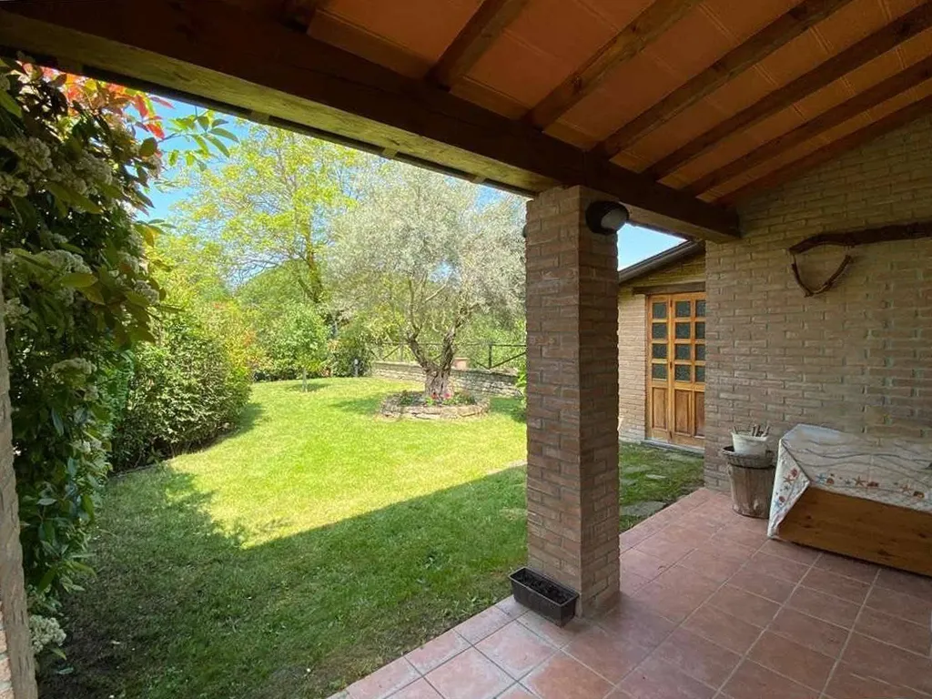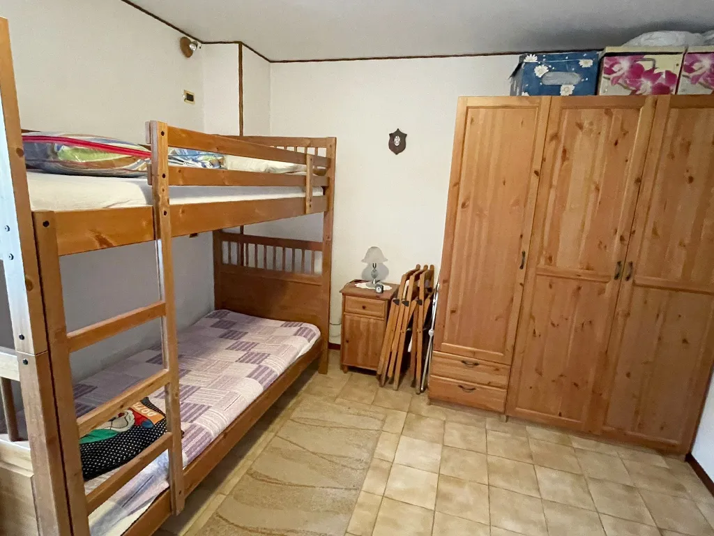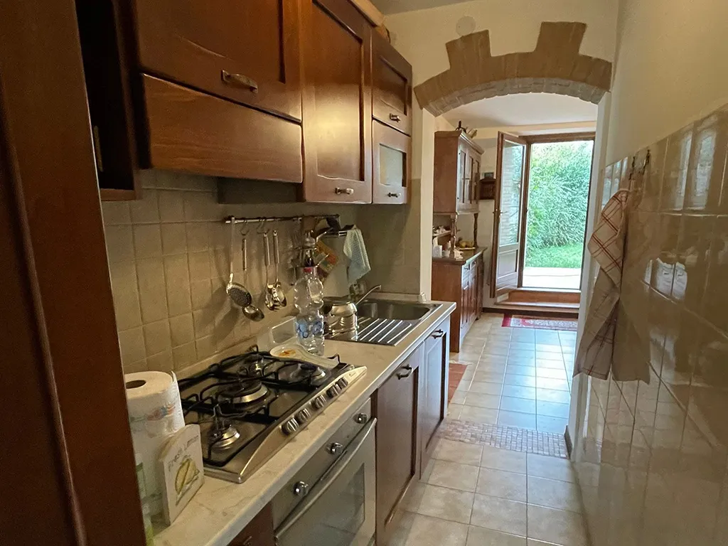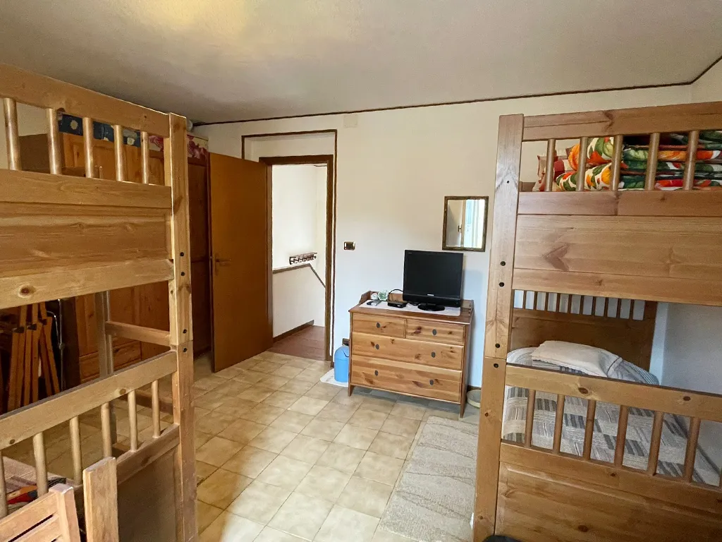 L'abitazione è disposta su due livelli, al piano terra troviamo ampio portico, ingresso, soggiorno con camino, cucinotto, bagno, lavanderia e legnania, al piano primo disimpegno e due camere.